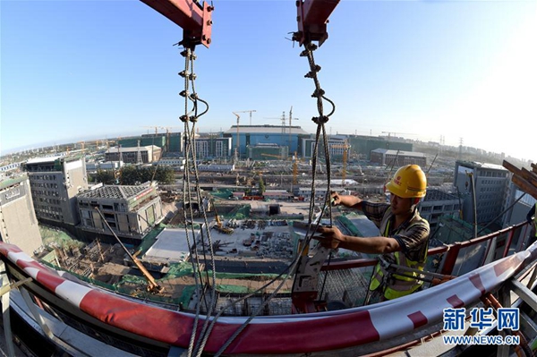 工人在北京建工集團城市副中心A2工程工地施工(2017年9月11日攝)。新華社記者 羅曉光 攝